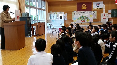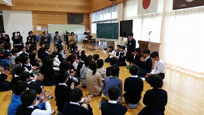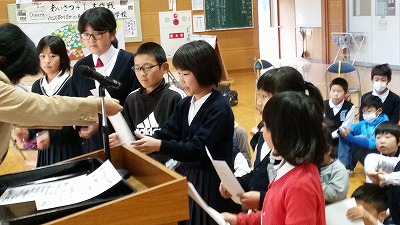 そして、校長先生の話。全員が目標を達成した自身からでしょう。寒い中ですがしっかり聞き入っています。最後に、冬休みのくらし。保健面では委員会と1年生のコラボでした。