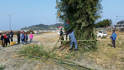 本日、29日午前9時からどんどやの準備です。5,6年生が集まりました。富小保護者OBの方の竹林から竹を運び出します。そして、富岡西港の広場で組み立てます。お父さん方の動き、技術は本当に心強いです。たくさんの方々にご協力いただきました。ありがとうございました。