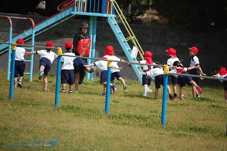 4月16日(月)、今日は天気もよく、1年生が元気に運動場で体育の授業です。