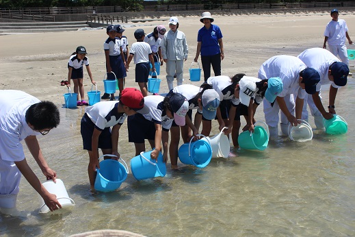 拓心高校マリン校舎の生徒さん達が育てた稚エビを5年生が富岡海水浴場で放流しました。