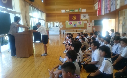 今日で、70日の長い1学期も無事終了します。1時間目に子ども達はホールに集まり、終業式に参加しました。終業式の前に漢字計算大会と、読書チャンピオンの表彰がありました。