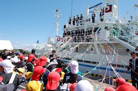 途中で、富岡港で行われた拓心高校マリン校舎の熊本丸の出港式に参加しました。