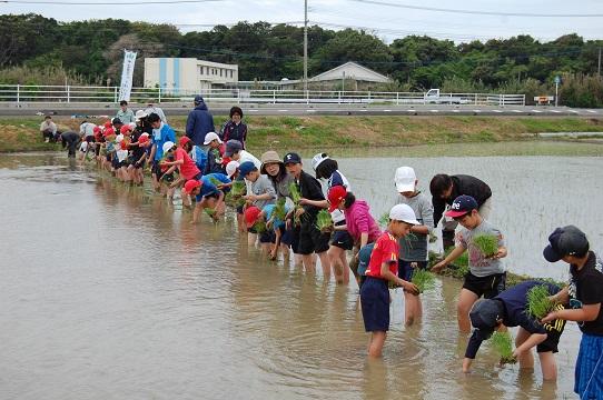 今年も美土里ネットさんのご協力で、5年生が田植え体験を行いました。