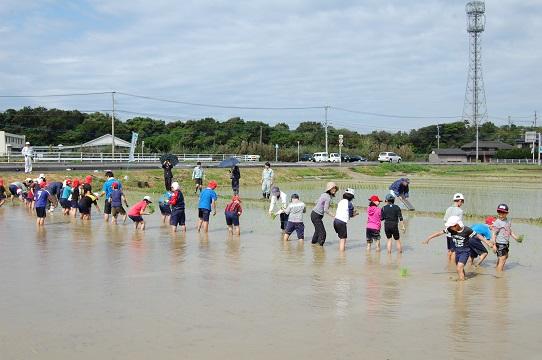 志岐小学校の5年生と一緒に一列ずつ苗を植えていきました。田んぼの中で思うように