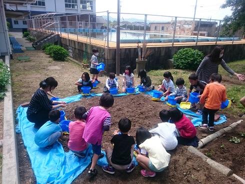 ました。生活科の学習で、1年生は朝顔の種を蒔いて、2年生はミニトマトの苗を