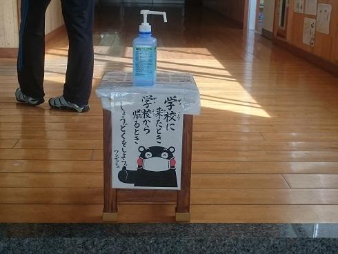 まずは、子ども達がアルコール消毒をするようにくまモンが呼びかけます。