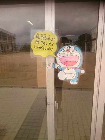 まずは、児童玄関でドラえもんがアルコール消毒を呼びかけます。