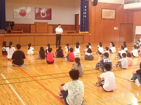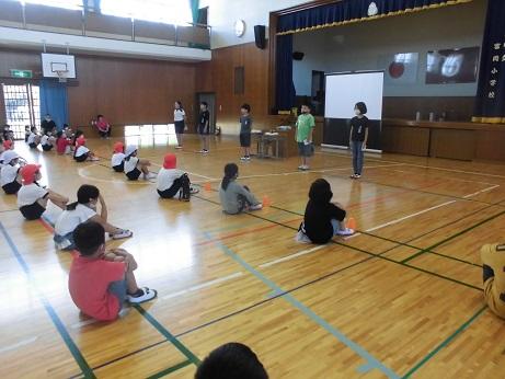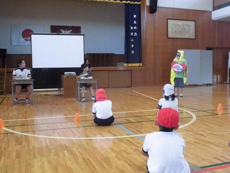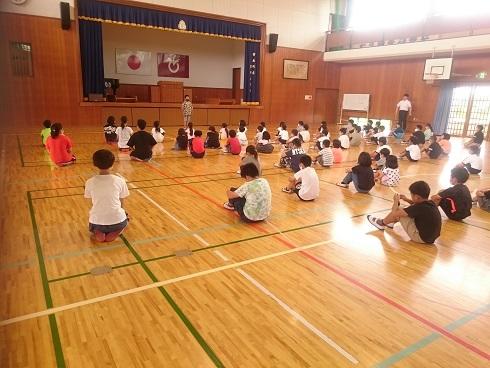 体育委員会の児童が中心となり、プール開き集会が行われました。体育館の窓を