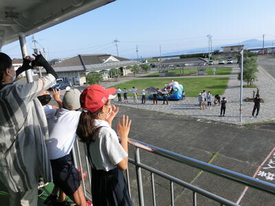 (2)保護者の方、先生方に見送られ出発。「6年生、行ってらっしゃい。」