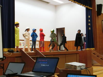 5年生は「環境戦隊マモルンジャー」というテーマで、環境を壊す宇宙人達をマモルンジャーが倒しながら、地球環境を守っていくストーリーです。一人一人の表現力が素晴らしく、大道具や小道具、衣装も見事でした。レベルの高い演劇を見せてもらいました。