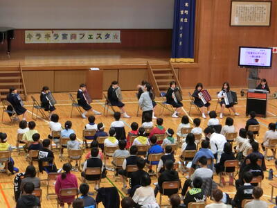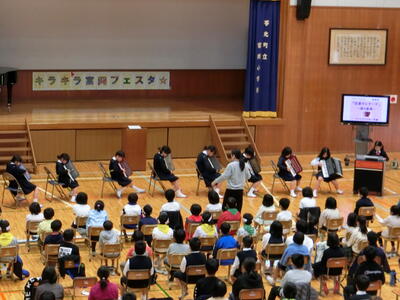 器楽部は、洲﨑先生の指揮に合わせて、「弦楽セレナーデ」を美しく揃った音で演奏してくれました。体全体を使ってアコーディオンやバスマスターを演奏する姿には迫力がありました。本当に素晴らしい演奏でした。