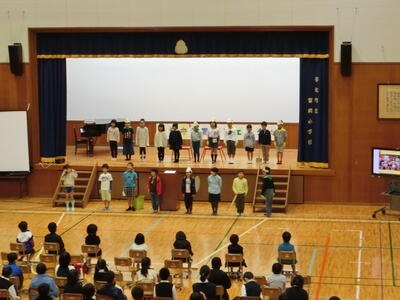 1年生は「言葉で表現、音で表現」ぼくのわたしのたからもの、というテーマで発表しました。体育館に響き渡る声、きれいにそろった歌声など一人一人が立派に役割を果たし、大きな成長を感じました。見事な発表でした。