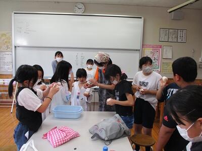 続いて、科学・物作りクラブ。ホイップクリームと塩を混ぜしっかり振ると、なんとバターができます。その後はホットケーキを作って、手作りバターをつけて食べました。楽しく、おいしい科学実験でしたね。