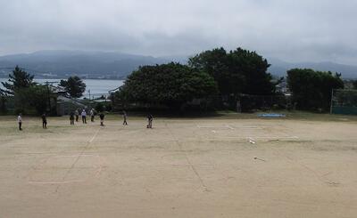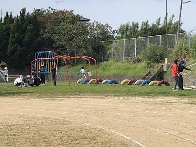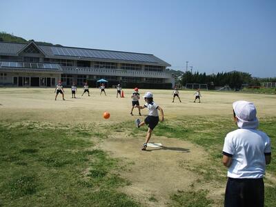 運動場では、スポーツクラブの活動が行われていました。2時間たっぷりスポーツを楽しみます。はじめの1時間は、キックベースボール、残り1時間は、缶けりのよう遊びをボールで行いました。2時間外で元気一杯に活動しました。