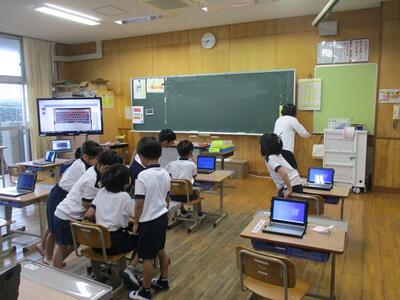 朝自習の時間、教室を回っていたら1年生がタブレットを使った活動をしていました。パスワードを入力してログインする方法を学んでいました。まだ習いたての平仮名や記号をキーボードで探しながらのログイン・・・早くできた子たちが、お助けマンとなってキーボードの文字を一緒に探してくれていました。無事ログインできたとき「やったー」と歓声が上がっていました。