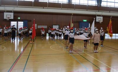 今週から運動会全体練習が始まりましたが、昨日と今日は雨のため運動場が使えず、体育館で全体練習や学年練習が行われていました。全体練習では、開閉会式の練習を行いました。入場行進、腕を大きく振って張り切って行進する姿は見ていて気持ちのいいものです。1年生も、上級生の動きを見ながら一生懸命練習に取り組んでいました。