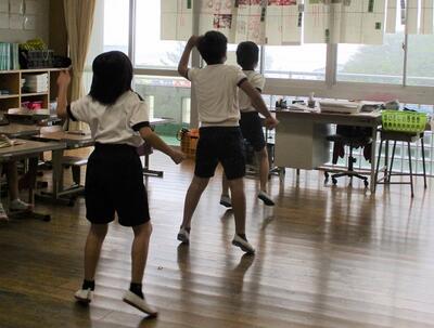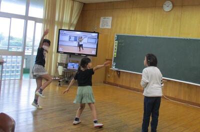 3年生は、昨日は教室でタブレットを使っていました。今日は、テレビの画面を見ながらダンスの練習。友達と楽しそうに踊っていました。