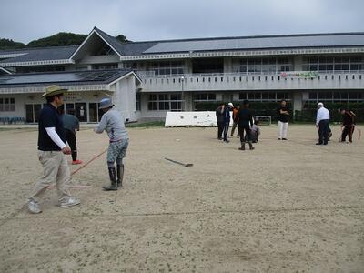 その後残りの時間は、みんなで運動会の準備を行いました。低学年は運動場の石拾いや草引きをしたり、高学年は長机や椅子を運んで本部席や来賓席をつくったりとそれぞれの役割をしっかりと果たしていました。