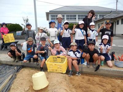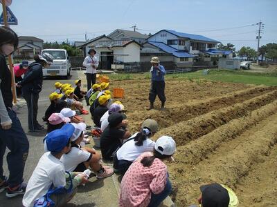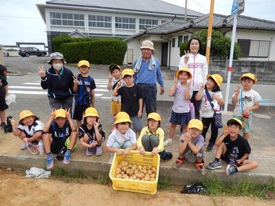 1・2年生によるジャガイモ掘りが行われました。子供たちがジャガイモを掘りやすいようにと、地域の方が週末草取りなどをしてくださっていました。子供たちは、形のいいおいしそうなジャガイモが、土の中からどんどん出てきて大喜びです。