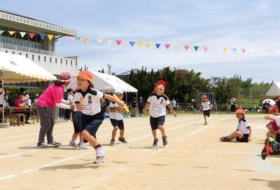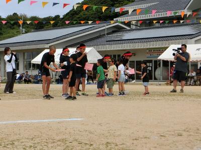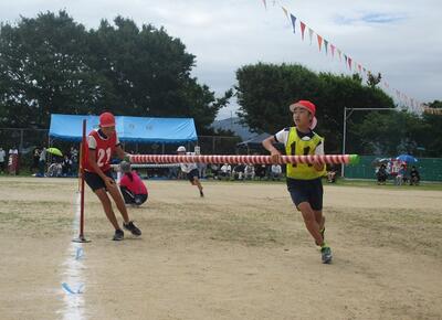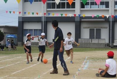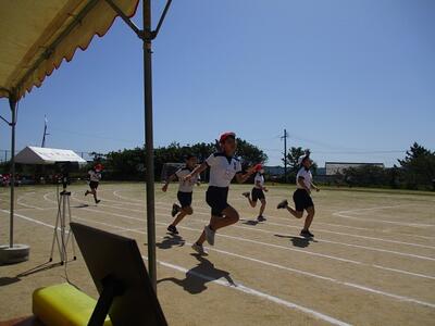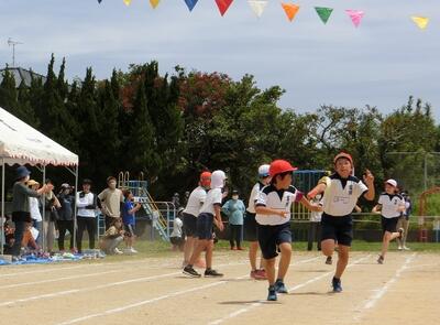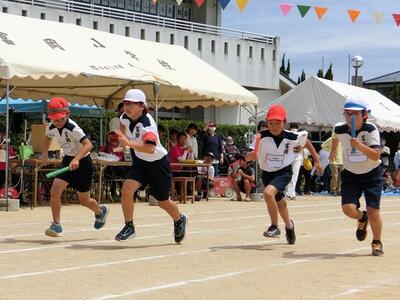 プログラム15番、低学年リレー「つないでつないで1,2,3!」上級生である3年生がうまくリードしながら1・2年生も一生懸命バトンをつなぎました。