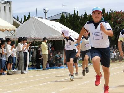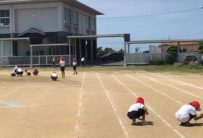 プログラム3番、1年徒走「60mへっちゃラン!」スタート前の選手紹介も、元気よく返事ができました。