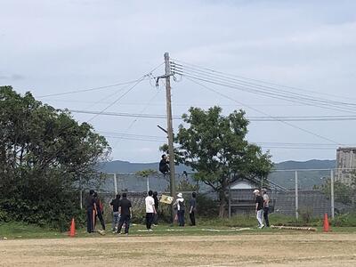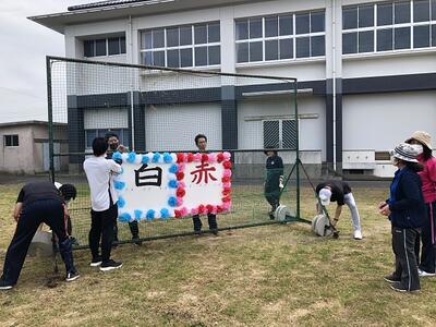 午後3時からは、PTAのみなさんによる準備が始まりました。三角旗取り付け、入退場門設置、遊具固定、得点板設置など子供たちではできない作業をしていただきました。