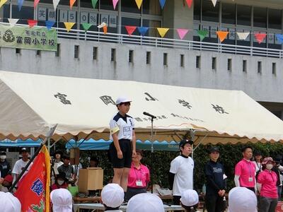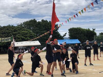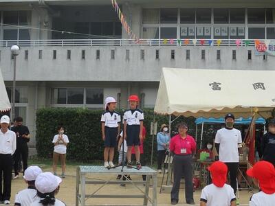 プログラム12番、5・6年応援合戦「150年の歴史もおうえんします!」5月に入り、昼休みもなく毎日練習してきた成果を発揮し、創立150周年にふさわしい演舞を披露した富小のリーダーたちでした。