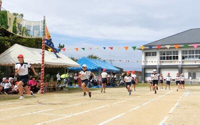 プログラム16番、高学年リレー「これで決めるぜ!150年目の優勝!」高学年の子供たちが心を一つにして優勝目指して最後の種目に挑みました。