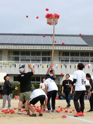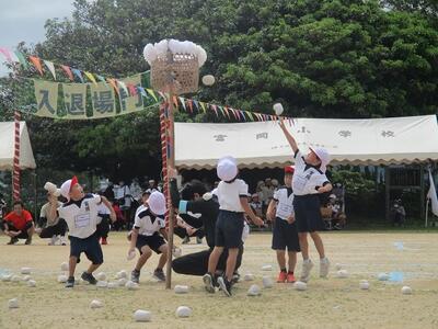 プログラム10番、1年生団体「にんたまいれたろう」忍者になりきって入場する姿がかわいらしかったです。赤白対決をした後は、これまた親子対決です。親のかごを高く上げ入りにくくしたため、子供たちの圧勝となりました。子供たちは大人たちに勝利し、大喜びでした。