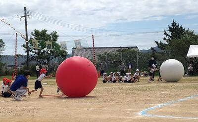 プログラム13番、2・3年生団体「2,3年生!あたらしいカオ(玉)よ!」赤白の大きな玉を2人で運ぶリレーです。自分たちの体より大きく前もよく見えないため、上手く玉を運べず苦戦していました。
