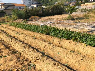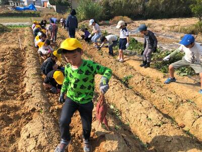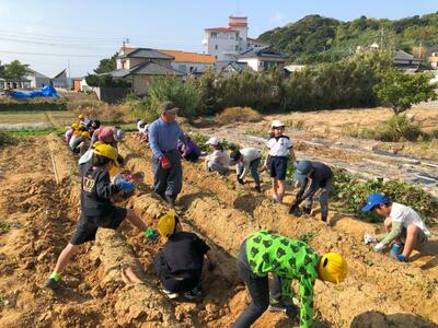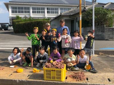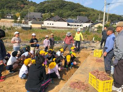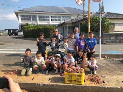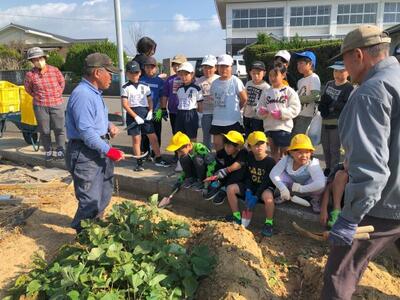 3・4時間目に、1・2年生は学校前の畑でいも掘りを行いました。いもの苗を植えてからこの日まで、畑の管理をしてくださった地域の方や、前地域学校協働活動推進員の方にも、手伝っていただきました。子供たちがいもを掘りやすいようにと、1列だけを残して後は全ていもの葉やつるを切っておいてくださっていました。