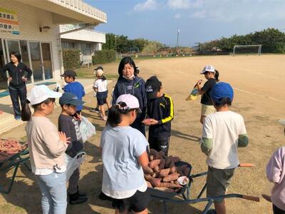 学校に帰ると、とれたいもをビニル袋に入れて家へのおみやげの準備。たくさん持って帰りたかったようですが、大きないもが多く、5~6個が限界だったようです。その日は、おいしいおいも料理となったことでしょう。
