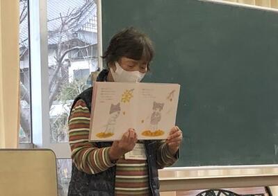 2冊目の本は、「さむがりやのねこ」。さむがりやのねこが、あたたかい南のくにをめざして旅に出ますが、途中で災難にあってしまいます。たどり着いた家の洋服かごの中で寝ていたところを服と一緒に洗濯され、絞られて、しまいには吹雪の中に干されてカチンコチンに凍ってしまいました。最後は、走って逃げるうち体が温まり、ねこはうれしくなってしまいます。・・・というお話です。展開がとても面白く、聞いている子供たちや担任の先生の笑顔が印象的でした。