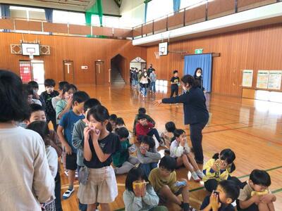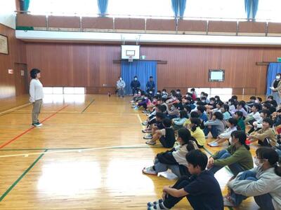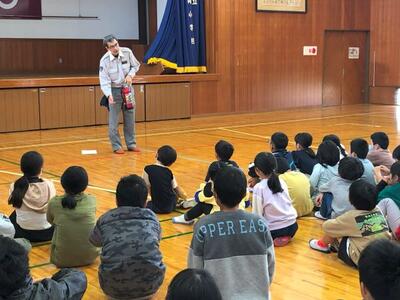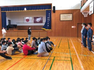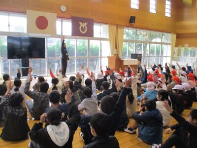避難の放送があってから、体育館に全員避難完了するまでの時間は、2分56秒でした。体育館では、消防署の方から火災の時どのような行動をとるとよいのか、天草管内や苓北町の火災の現状、消火器の使い方などについて詳しくお話しいただきました。子供たちも興味津々、いい反応をしながら集中して聞いていました。