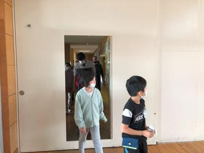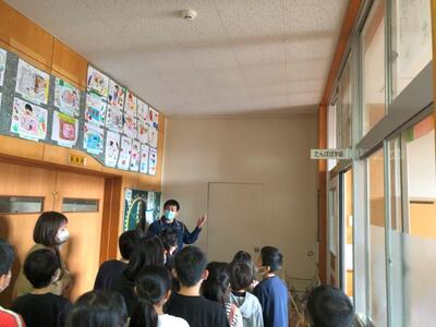 最後に、お礼の言葉を述べて避難訓練終了。今回は、1階の防火扉を閉め、その扉の役割や使い方についても説明していただき、教室に帰るときに扉を通る体験もすることができました。