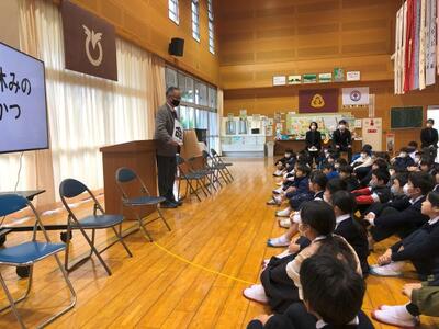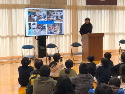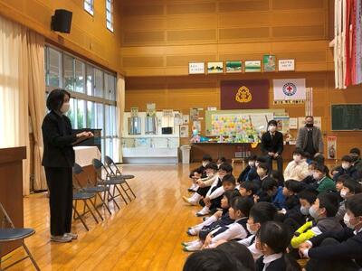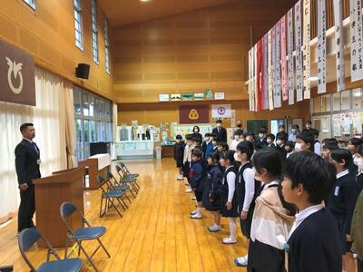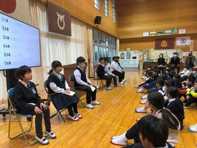 校長からは、2学期の頑張りを4つの花(がんばり・なかよし・元気・感謝)で振り返りました。とくに始業式で話した「『ありがとう』が飛び交う素敵な学校・家庭・地域に!」については、150周年記念式典の子供たちの発表を中心に大きな成長があったことを伝えました。そして、冬休みも家庭や地域で感謝の気持ちをお手伝いやボランティア等自ら進んで行動していくことで表し、『ありがとう』の言葉がたくさん飛び交うようにしてほしいと話しました。