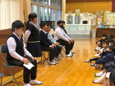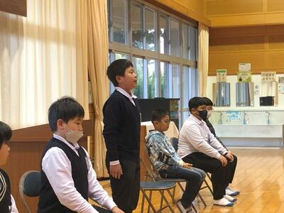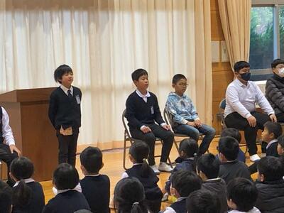 2学期、かけ算九九、文化展、フェスタ、漢字計算大会・・・など行事や活動で力一杯取り組み、成果を上げられたことを、全員が原稿を見ないで堂々と発表していきます。また、冬休みは「クリスマスプレゼントが楽しみ」「家の掃除を頑張って気持ちのよい新年を迎えたい」「早く宿題を終わらせて、たくさん遊びたい」・・・と今から始まる冬休みに大きな期待をふくらませていました。