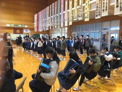 続いて、生徒指導担当からは、冬休みのくらしについて「命」「楽・幸」「夢」のキーワードを使って話がありました。図書担当からは、2学期に貸し出された本の冊数が発表され(何と9002冊!、年間目標の10312冊まであと1310冊です)、冬休みの図書室利用やタブレット利用について話がありました。養護教諭は、冬休みの健康について「サンタからのプレゼント」とおもむろにカードを取り出し、「ふ・ゆ・や・す・み」の頭文字を使って健康のために気を付けることを話しました。最後に、器楽部の伴奏で校歌を元気よく歌って式を終えました。