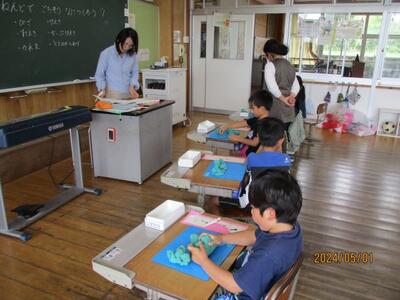 1年生は、図工。粘土でケーキ、スパゲティ、オムライス・・・など思い思いのごちそうをつくっていました。トッピングを工夫して作ったり、盛り付けを工夫したりとお話ししながら夢のあるごちそうに仕上がっていました。