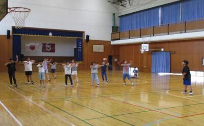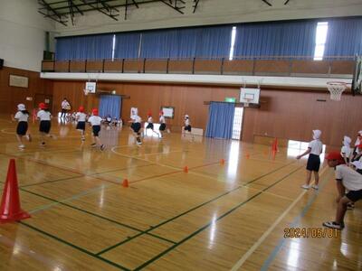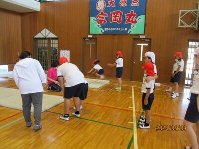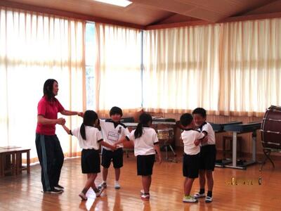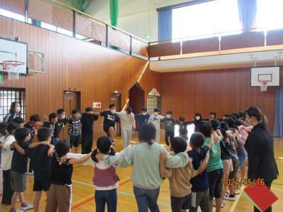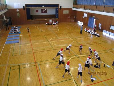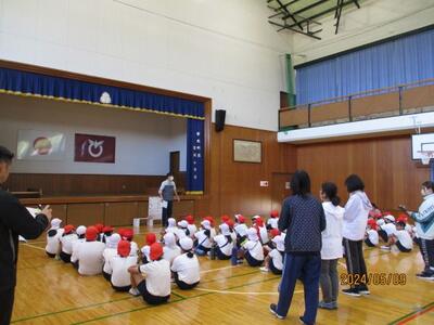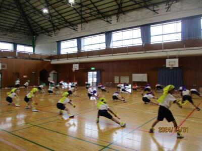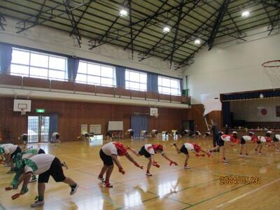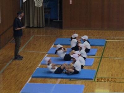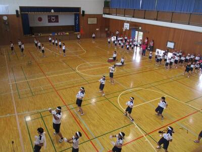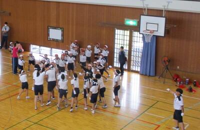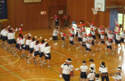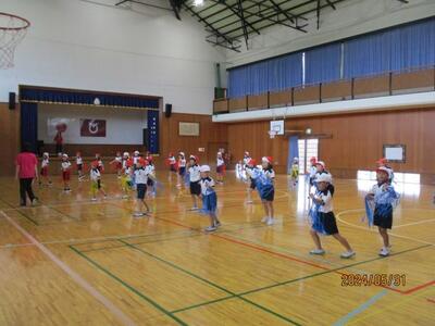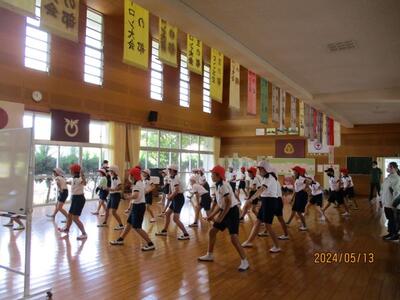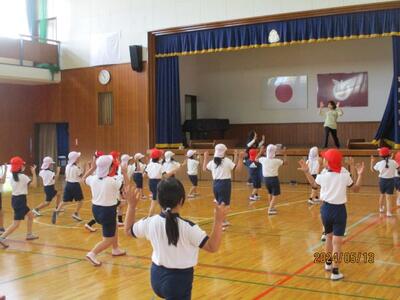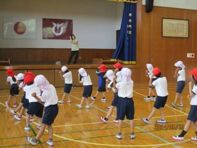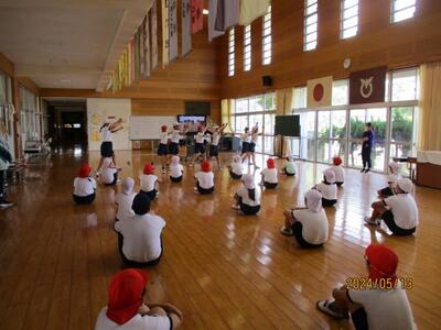 3時間目は、体育館で1~3年生の体育が行われていました。今日からいよいよ、運動会に向けてのダンスの練習スタートです。ステージに立つ先生のふりを見ながら、子供たちはどんどんダンスを覚えていきます。一つ一つのポーズがとてもかわいらしい下学年の子供たちのダンスでした。