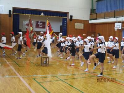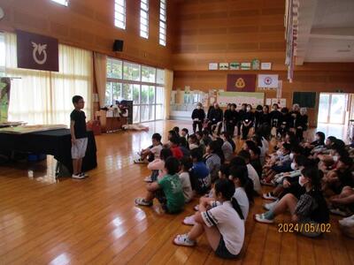 朝の活動の時間を使って、運動会の結団式が行われました。まず、赤団、白団の団長の任命式を行い、各団長から力強い決意が述べられました。そして、6年生が考えてくれた運動会スローガン「創立151年! 最後まで燃え続けろ 赤組 光のように突き進め 白組 創りだそう 新たなキセキを!!」が発表されました。(キセキは、奇跡と軌跡をかけているそうです)