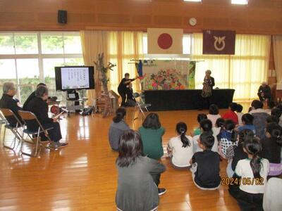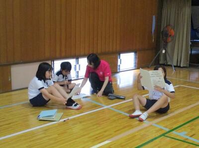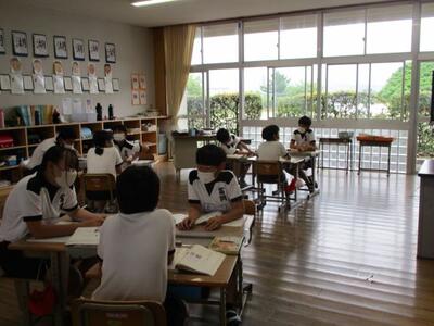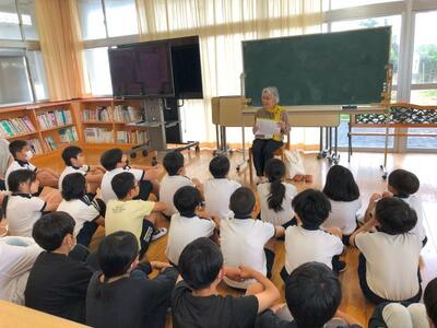 まずは、読み聞かせ。月曜日がお休みの日が多かったため、今日が今年度初めての読み聞かせとなりました。「かさこじぞう」と「海をかっとばせ」の2つのお話でした。絵本はなくても、お話から頭の中でイメージを膨らませて聞いていた高学年の子供たちでした。
