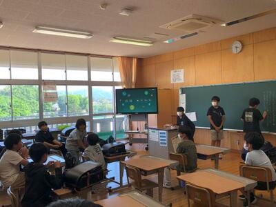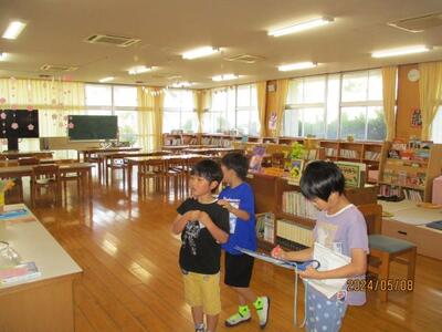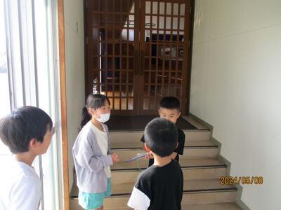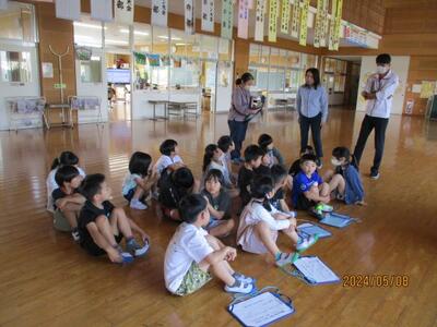 1年生は、2年生の説明をしっかりと聞き、楽しそうにいろいろな部屋を回っていました。数カ月前までは、お世話されるばかりだった2年生が、1年生を連れて校内を回りしっかりとお世話ができるお兄さん・お姉さんに成長していて、とても嬉しくなりました。少し、早く学校探検が終わったので、運動場に出て一緒に遊びました。