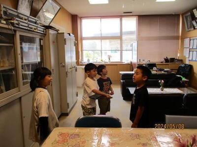 1時間目から、2年生が1年生を連れてグループごとに、学校のいろいろな部屋を案内する「学校探検」が行われていました。体育館、校長室、職員室、図書室、保健室・・・2年生は、あらかじめ用意していたシナリオをチラリと見ながら、1年生に丁寧に部屋の説明をしていました。