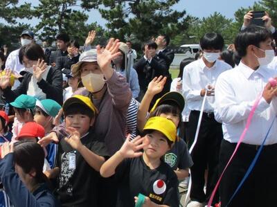 紙テープをもち、高校生をしっかり見送った子供たちでした。