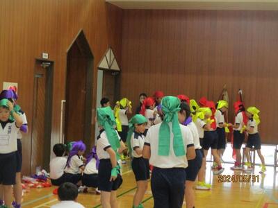 2時間目。上学年の練習。ソーラン節の衣装を着ける練習からです。サテン生地のため、つるつるすべり、結ぶのに苦労していました。しかし、踊り始めると上級生としての気迫が伝わってきます。太鼓や旗も入って勇壮な踊りに仕上がっていました。