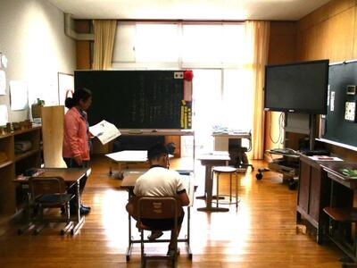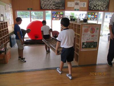午後からは、4~6年生による準備です。雨のため、全員で児童玄関まで椅子や机を運び、その後各係に分かれて確認や準備を行いました。