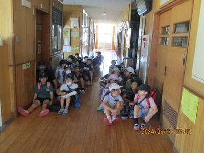 午後3時10分、大雨洪水警報が発令されたという設定で放送があり、子どもたちは帰りの用意をして一度ホールに集合します。担当から風水害の危険やどんな行動をとるとよいのか話があり、その後お迎えを待つ場所に移動します。1・6年、たんぽぽ学級はあこうルーム前の廊下、2・3年は中央階段、4・5年は更衣室前の廊下に並んで名前を呼ばれるのを静かに待っていました。
