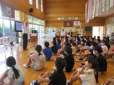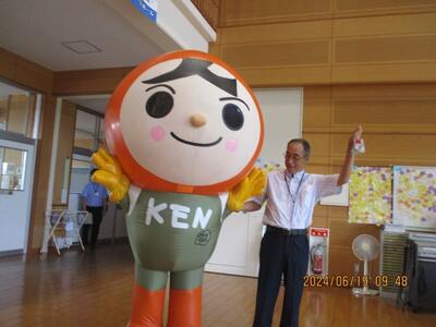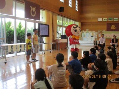 伝達式が終わると、子どもたちは握手をしたり話しかけたり・・・と大人気のまもるくんとあゆみちゃんでした。かわいいマスコットキャラクターと全校児童で撮った記念写真はとてもいい思い出になったようです。