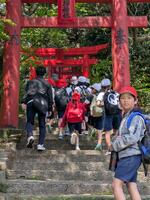 赤い鳥居の階段を上ると、石垣が見えてきました。鳥居には奉納された方や企業のお名前、制作者ののお名前なども書いてあり、興味深く眺めさせていただきました。